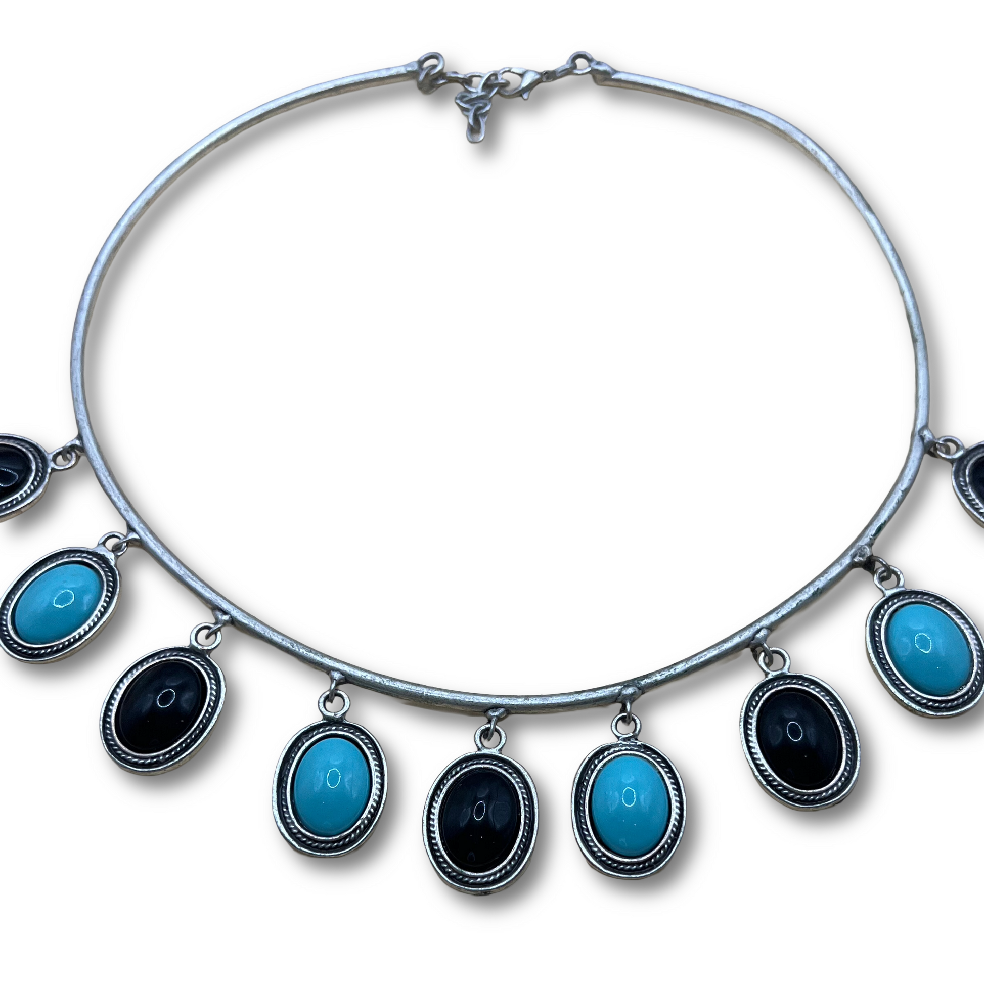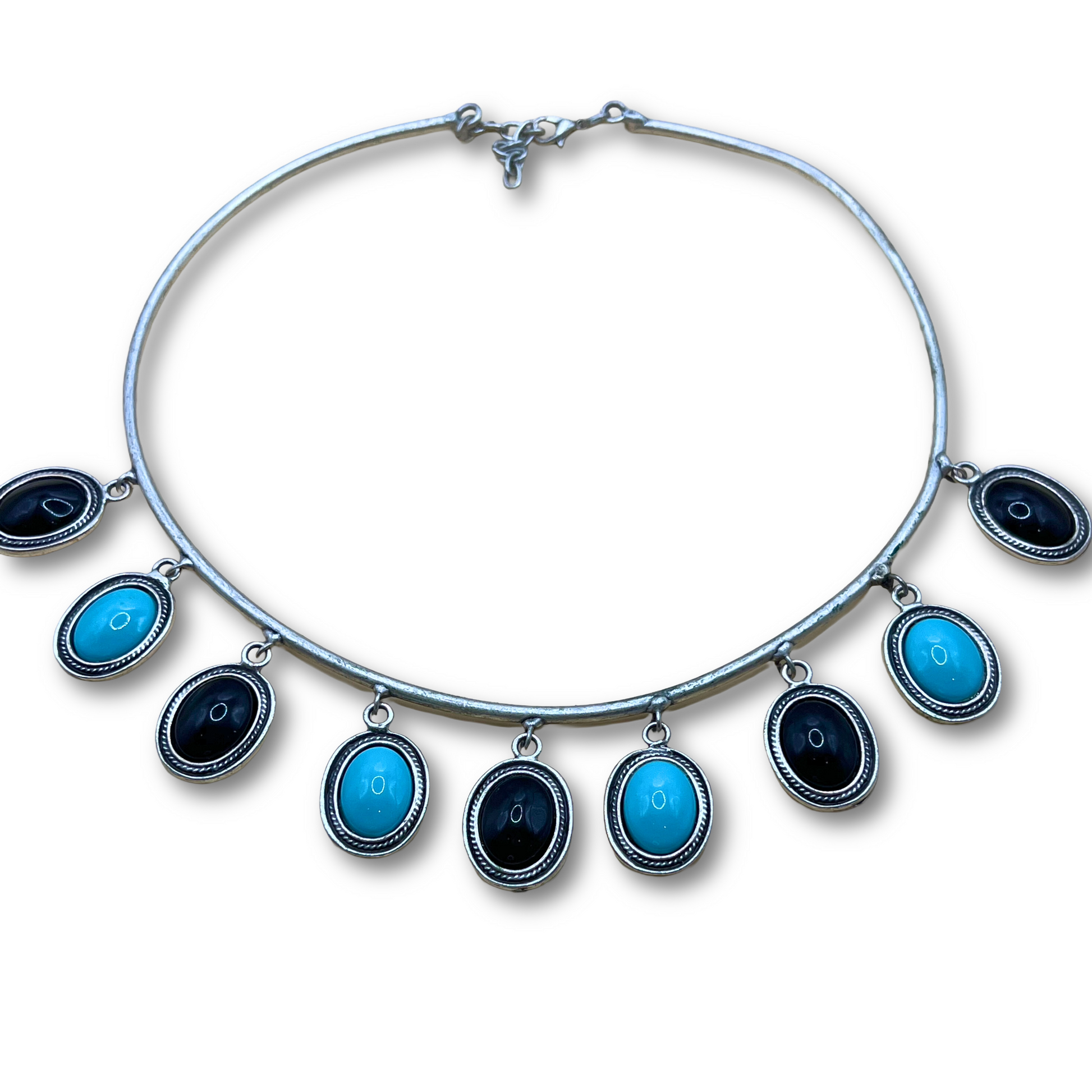 Unleash bold contrast with the Turquoise and Onyx Necklace! A necklace with alternating turquoise and onyx ovals offers enduring resilience. Perfect for the daring individualist.