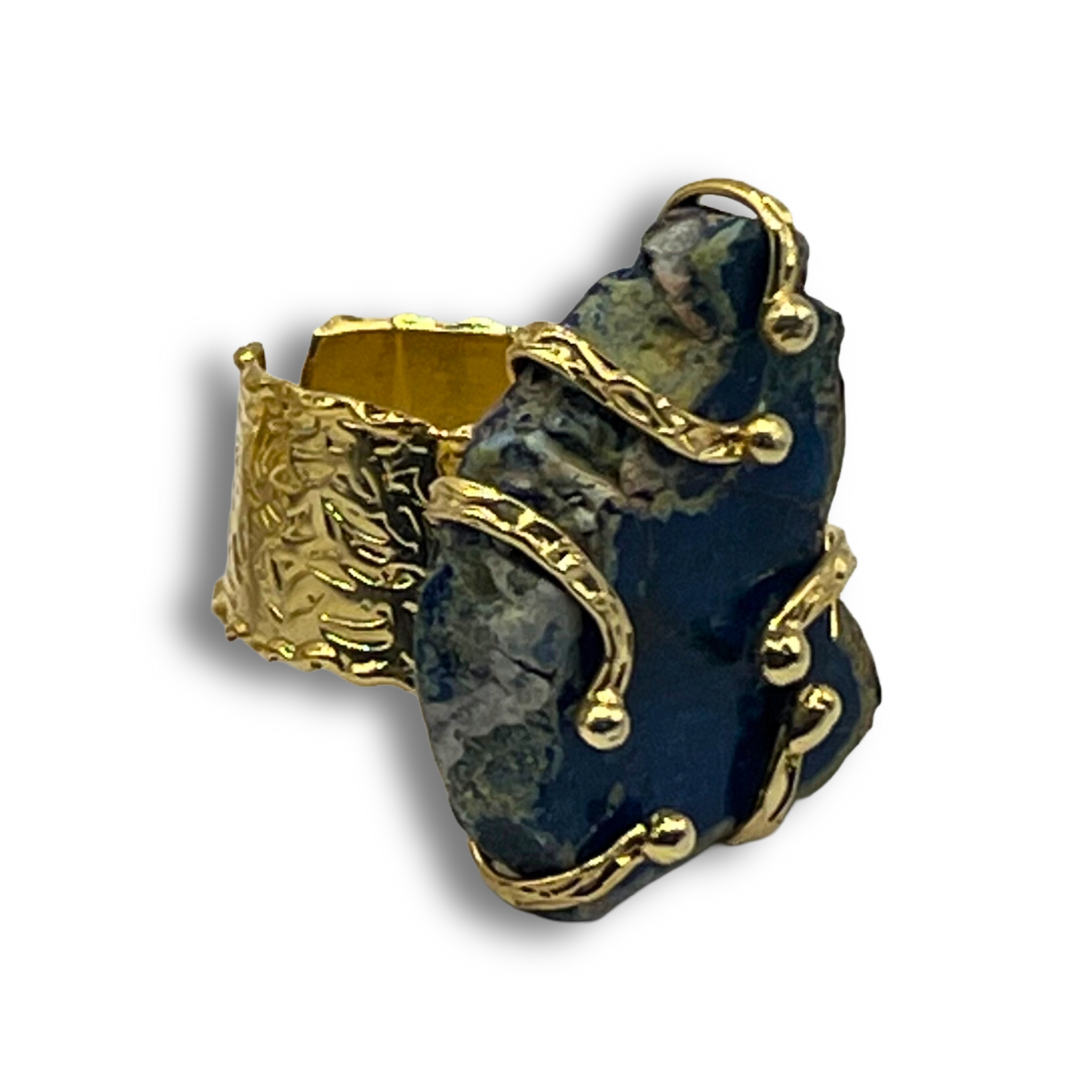Embrace natural mystique with the Turquoise and Quartz Cuff Bracelet and Ring Set! This captivating piece features a blue turquoise stone and white quartz wrapped in intricate gold-plated vines, empowering your earthy confidence.